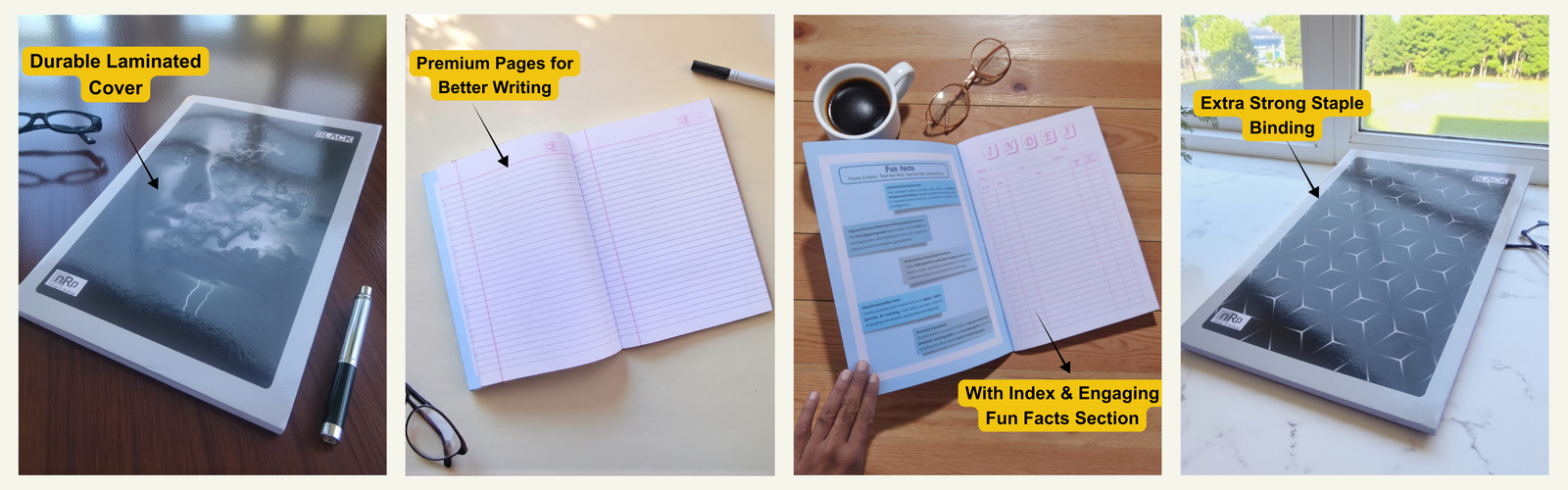 The nRp Black A4 Notebook (152 Pages) features premium 70 GSM paper, a matte black cover with glossy UV geometric finish, and perfect binding for durability. Elegant, eco-friendly, and A4-sized — built for professionals, creators, and dreamers. Crafted with 70GSM Premium-Quality Paper, it ensures a smooth, effortless writing experience with no ink bleed or smudging. The 450 GSM Matte Laminated Cover provides superior durability and texture, while the Perfect Binding gives it a sleek, book-like form that feels as premium as it looks.